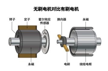 一、有刷電機的原理有刷電機采用機械換向,磁極不動,線圈旋轉。電機工作時,線圈和換向器旋轉,磁鋼和碳刷不轉,線圈電流方向的交替變化是隨電機轉動的換相器和電刷來完成的。在有刷電機中,這個過程是將各組線圈的兩個電源輸入端,依次排成一個環,相互之間用絕緣材料分隔,組成一個象圓柱體的東西,與電機軸連成一體,電源通過兩個碳元素做成的小柱子(碳刷),在彈簧壓力的作用下,從兩個特定的固定位置,壓在上面線圈電源輸入環狀圓柱上的兩點,給一組線圈通電。隨著電機轉動,不同時刻給不同線圈或同一個線圈的不同的兩極通電,使得線圈產生磁場的N-S極與***靠近的永磁鐵定子的N-S極有一個適合的角度差,磁場異性相吸、同性相斥,產生力量,推動電機轉動。碳電極在線圈接線頭上滑動,象刷子在物體表面刷,因此叫碳“刷”。相互滑動,會摩擦碳刷,造成損耗,需要定期更換碳刷;碳刷與線圈接線頭之間通斷交替,會發生電火花,產生電磁破,干擾電子設備。二、無刷電機工作原理無刷電機采取電子換向,線圈不動,磁極旋轉。無刷電機,是使用一套電子設備,通過霍爾元件,感知永磁體磁極的位置,根據這種感知,使用電子線路,適時切換線圈中電流的方向,保證產生正確方向的磁力,來驅動電機。消除了有刷電機的缺點。這些電路,就是電機控制器。無刷電機的控制器,還可以實現一些有刷電機不能實現的功能,比如調整電源切換角,制動電機,使電機反轉,鎖住電機,利用剎車信號,停止給電機供電?,F在電瓶車的電子報警鎖,就充分利用了這些功能。無刷直流電機由電動機主體和驅動器組成,是一種典型的機電一體化產品。由于無刷直流電動機是以自控式運行的,所以不會象變頻調速下重載啟動的同步電機那樣在轉子上另加啟動繞組,也不會在負載突變時產生振蕩和失步。三、調速方式的區別實際上兩種電機的控制都是調壓,只是由于無刷直流采用了電子換向,所以要有數字控制才可以實現了,而有刷直流是通過碳刷換向的,利用可控硅等傳統模擬電路都可以控制,比較簡單。1、有刷馬達調速過程是調整馬達供電電源電壓的高低。調整后的電壓電流通過整流子及電刷地轉換,改變電極產生的磁場強弱,達到改變轉速的目的。這一過程被稱之為變壓調速。2、無刷馬達調速過程是馬達的供電電源的電壓不變,改變電調的控制信號,通過微處理器再改變大功率MOS管的開關速率,來實現轉速的改變。這一過程被稱之為變頻調速。四、性能差異1、有刷電機結構簡單、開發時間久、技術成熟早在十九紀誕生電機的時候,產生的實用性電機就是無刷形式,即交流鼠籠式異步電動機,這種電動機在交流電產生以后得到了廣泛的應用。但是,異步電動機有許多無法克服的缺陷,以致電機技術發展緩慢。尤其是直流無刷電機一直無法投入商業運營,伴隨著電子技術的日新月異,直***近幾年才慢慢投入商業運營,就其實質來說依然屬于交流電機范疇。無刷電機誕生不久,人們就發明了直流有刷電機。由于直流有刷電機機構簡單,生產加工容易,維修方便,容易控制;直流電機還具有響應快速、較大的起動轉矩、從零轉速***額定轉速具備可提供額定轉矩的性能,所以一經問世就得到了廣泛應用。2、直流有刷電機響應速度快,起動扭矩大直流有刷電機起動響應速度快,起動扭矩大,變速平穩,速度從零到***大幾乎感覺不到振動,起動時可帶動更大的負荷。無刷電機起動電阻大(感抗),所以功率因素小,起動扭矩相對較小,起動時有嗡嗡聲,并伴隨著強烈震動,起動時帶動負荷較小。3、直流有刷電機運行平穩,起、制動效果好有刷電機是通過調壓調速,所以起動和制動平穩,恒速運行時也平穩。無刷電機通常是數字變頻控制,先將交流變成直流,直流再變成交流,通過頻率變化控制轉速,所以無刷電機在起動和制動時運行不平穩,振動大,只有在速度恒定時才會平穩。4、直流有刷電機控制精度高直流有刷電機通常和減速箱、譯碼器一起使用,使的電機的輸出功率更大,控制精度更高,控制精度可以達到0.01毫米,幾乎可以讓運動部件停在任何想要的地方。所有精密機床都是采用直流電機控制精度。無刷電機由于在啟動和制動時不平穩,所以運動部件每次都會停到不同的位置上,必須通過定位銷或限位器才可以停在想要的位置上。5、直流有刷電機使用成本低,維修方便。 由于直流有刷電機結構簡單,生產成本低,生產廠家多,技術比較成熟,所以應用也比較廣泛,比如工廠、加工機床、精密儀器等,如果電機故障,只需更換碳刷即可,每個碳刷只需要幾元,非常便宜。無刷電機技術不成熟,價格較高,應用范圍有限,主要應在恒速設備上,比如變頻空調、冰箱等,無刷電機損壞只能更換。6、無電刷、低干擾無刷電機去除了電刷,***直接的變化就是沒有了有刷電機運轉時產生的電火花,這樣就極大減少了電火花對遙控無線電設備的干擾。7、噪音低,運轉順暢無刷電機沒有了電刷,運轉時摩擦力大大減小,運行順暢,噪音會低許多,這個優點對于模型運行穩定性是一個巨大的支持。8、壽命長,低維護成本少了電刷,無刷電機的磨損主要是在軸承上了,從機械角度看,無刷電機幾乎是一種免維護的電動機了,必要的時候,只需做一些除塵維護即可。